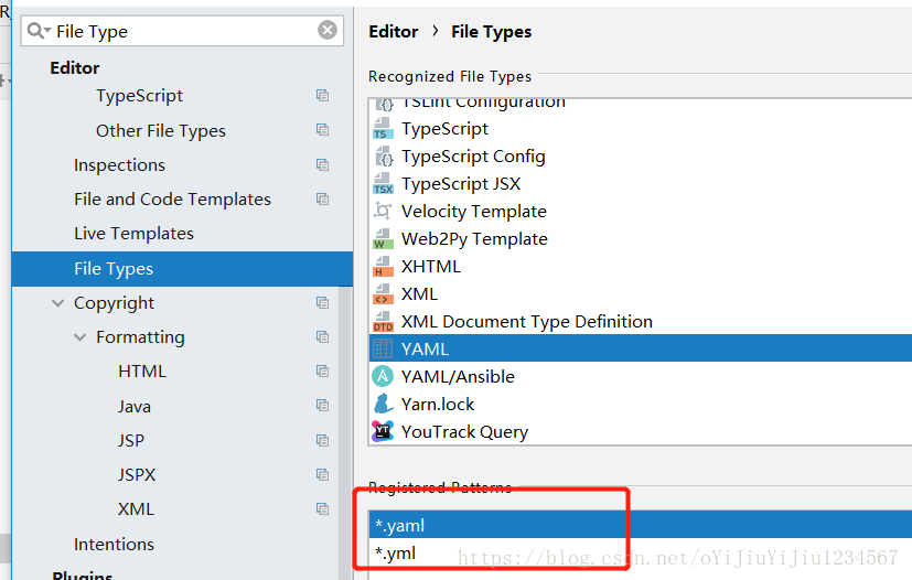 2.再Settings中找到File Types然后找YAML看看是否有yml后缀名