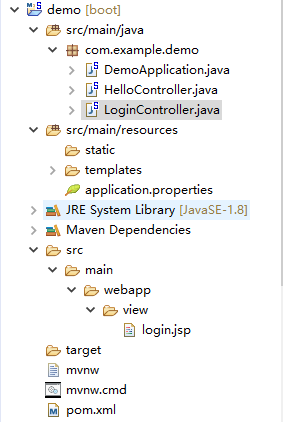 既然是集成jsp,肯定少不了jsp页面,这里我把jsp页面login.jsp放在了/demo/src/main/webapp/view下。在jsp中获取Controller中的一个变量值。