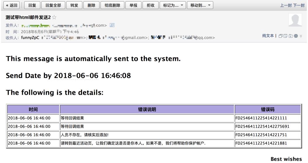 以上我是将邮件功能封装成一个服务类,使用的时候只需要将当前类注入 然后直接调用即可,以上封装了两个方法:一个是简单邮件发送,一个是带html table的邮件,如果需要发送附件,需将附件放入到MimeMessageHelper里面(调用addAttachment("文件名", 文件))方法即可,这里因为无实际需求,遂就略去了,好了,邮件发送功能已经完成,这里看下实际效果: