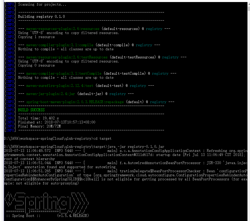 4、生成成功后就是运行了,运行方式是进入target目录然后运行 java -jar 文件名 命令,然后就运行了;来个图吧;