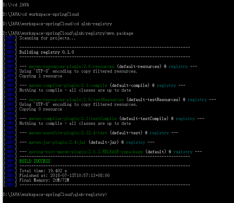 2、将目录切换到自己的工程跟目录下,然后运行 mvn package 命令;出现如下就成功了;