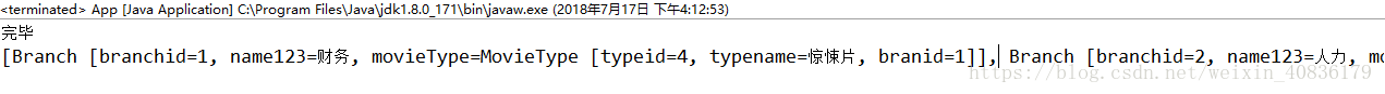 [Branch [branchid=1, name123=财务, movieType=MovieType [typeid=4, typename=惊悚片, branid=1], staffSet=[Staff [staffid=1, staffname=小米, branid=1], Staff [staffid=2, staffname=小明, branid=1]]], Branch [branchid=2, name123=人力, movieType=MovieType [typeid=2, typename=喜剧片, branid=2], staffSet=[Staff [staffid=3, staffname=小曼, branid=2]]], Branch [branchid=3, name123=销售, movieType=MovieType [typeid=3, typename=爱情片, branid=3], staffSet=[Staff [staffid=4, staffname=小影, branid=3]]]]