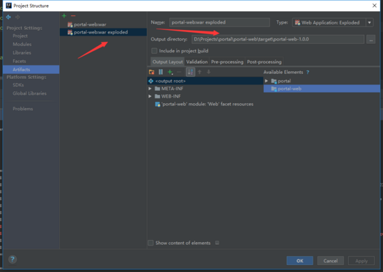在Project Structure视图中,在Project setting --> Articfacts选项中,选择war:Exploded类型的modules,然后设置编译输出项目的路径