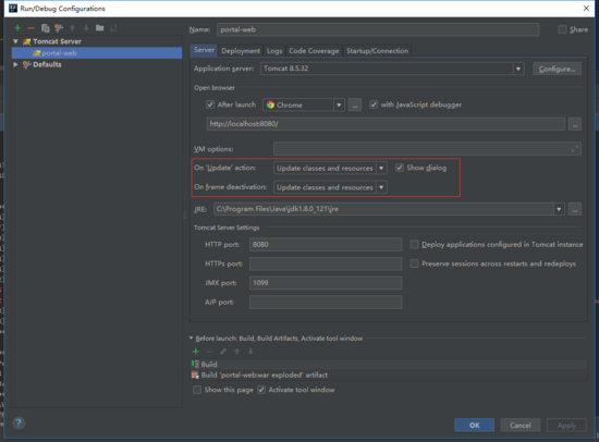 注:如果选项中没有update classes and resources 选项,则是由于服务器添加的Artifact类型问题,一般一个module对应两种类型的Artifact,一种是war,一种是war explored。war就是已war包形式发布,当前项目是这种形式,在这种形式下on frame deactivation配置没有update classes and resources选项。war explored是发布文件目录,选择这种形式,on frame deactivation中就出现update classes and resources选项了。