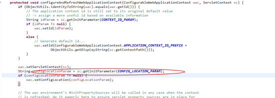 上面可以看出其实我们也可以自定义spring web的上下文的,那么怎么去指定我们自定义的上下文呢?答案是通过在 web.xml 中指定 contextClass 参数,因此第一小结结尾时说 contextClass 参数和 contextConfigLocation 很重要~~至于 contextConfigLocation 参数,我们跟进 configureAndRefreshWebApplicationContext 即可看到,如下图: