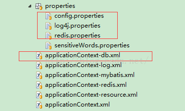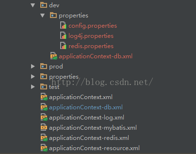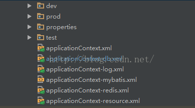 我的目录结构是相对复杂的一种有2层目录,只有一层目录的也一样更简单。外层xml文件,还有一个properties文件夹。这里我针对不同环境需要更改的配置文件有4个,标红的。