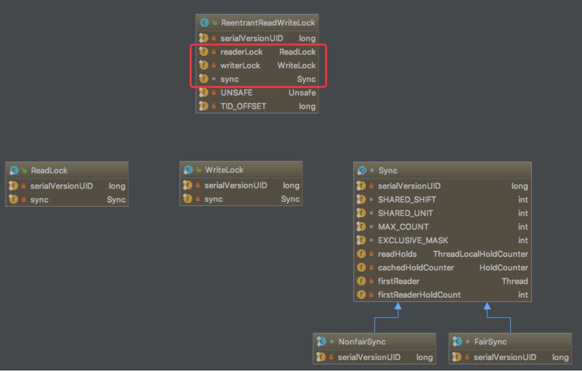 ReentrantReadWriteLock的核心是由一个基于AQS的同步器Sync构成,然后由其扩展出ReadLock(共享锁),WriteLock(排它锁)所组成。
