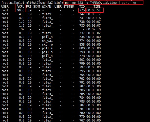 ps -mp 733 -o THREAD,tid,time | sort -rn