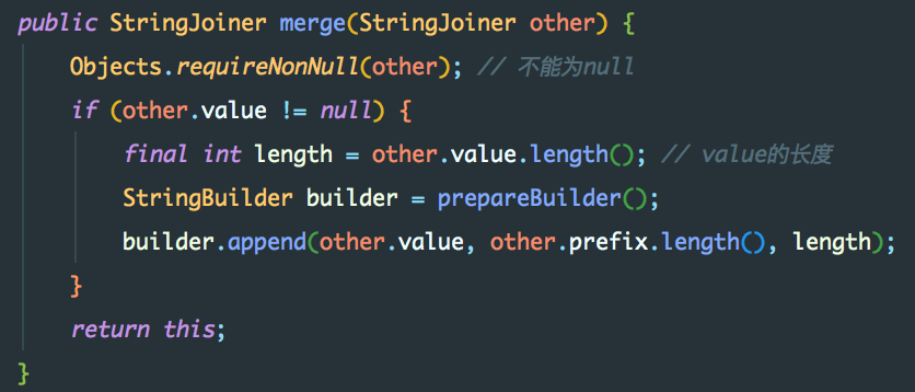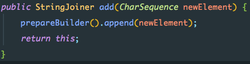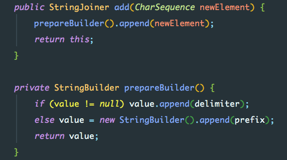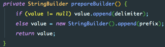 由于前面add("1")执行完了, 所以导致value已经不是null了. 所以这里会执行prepareBuilder方法里的if语句. 在value后直接追加一个delimiter分隔符. 然后返回这个value.
