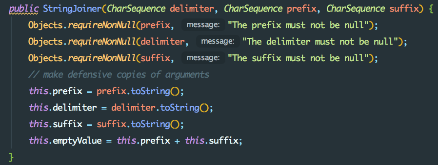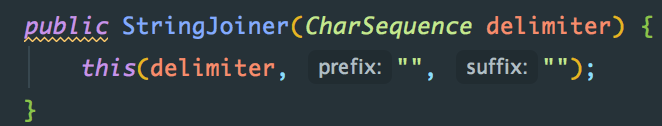 这个构造器要传入三个参数. 第一个是`分隔符` , 第二个是`前缀` , 第三个是 `后缀`. 现在不明白也没有关系, 下面待会儿会详细介绍.