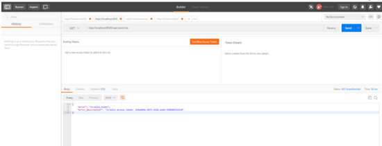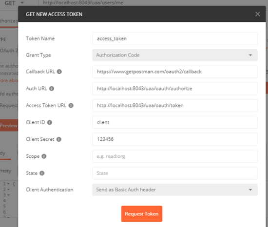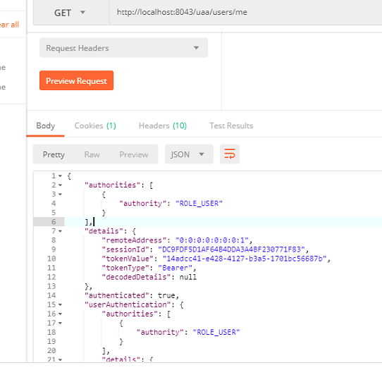 好了,所有的开发工作已经完成,无需任何其他配置,现在我们启动服务器,并通过 Postman 访问 http://localhost:8043/uaa/users/me
