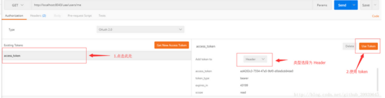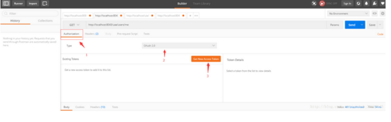 现在我们使用 Postman 来获取 access_token ,首先选择 Authorization Tab, 然后选择 Type 为 OAuth2.0 ,最后点击 Get New Access Token 按钮: