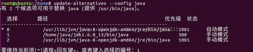 ·输入命令:update-alternatives --config java,在末端输入1,回车,即选择我们自己安装的jdk。