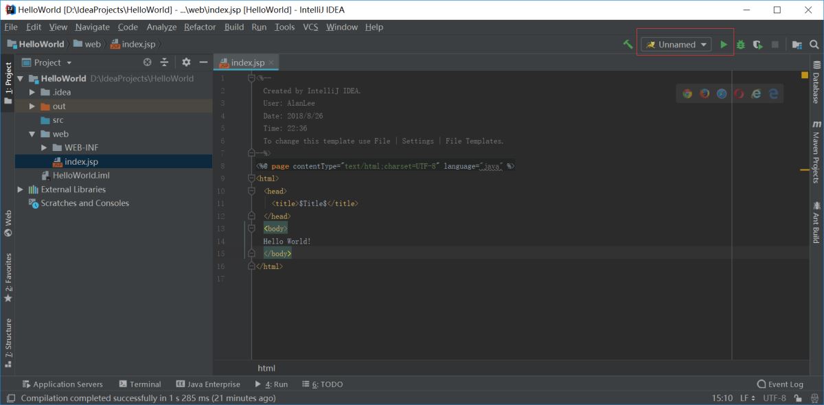 修改成Hello World之后,让我们来将项目部署到Tomcat服务器