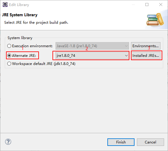 选择Alternate JRE 如2处的下拉框只有jre,点击3处的Install JREs,依次经过add——Standard VM——next——Directory,选择本机的jdk位置点击finish