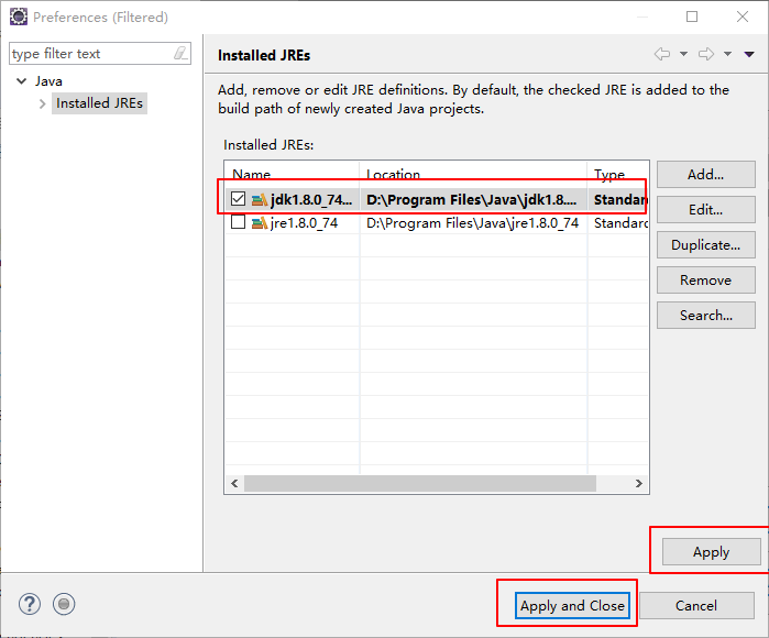 在install JREs位置将默认勾选更改jdk,如下图所示,并保存。