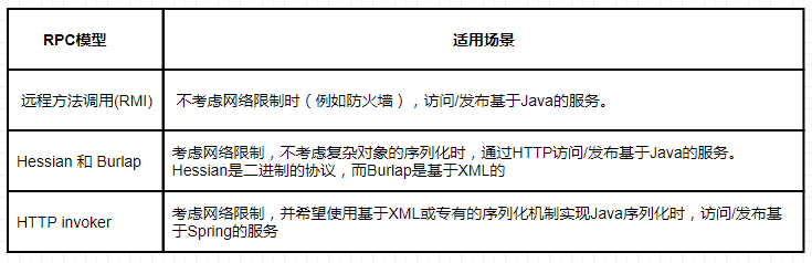 Spring支持多种不同的RPC模型,包括RMI、Caucho的Hessian和Burlap以及Spring自带的HTTP invoker: