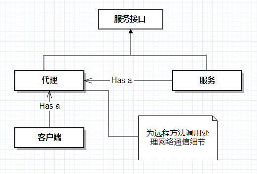 客户端向代理发起调用,就像代理提供了这些服务一样。代理代表客户端和远程服务进行通信,由它负责处理连接的细节并向远程服务发起调用。