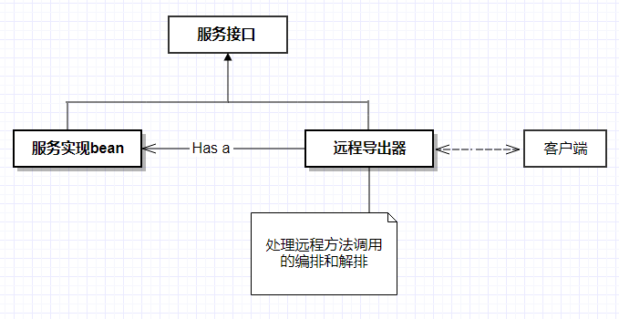 Spring 提供了简单的方式来发布RMI服务,在服务端,RmiServiceExporter 可以把任何 Spring 管理的bean发布为RMI服务 ,如图所示,RmiServiceExporter 把bean包装在一个适配器类中,然后适配器类被绑定到RMI注册表中,并且代理到服务类的请求。