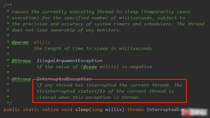 下面的这断代码大家应该再熟悉不过了,线程休眠需要捕获或者抛出线程中断异常,也就是你在睡觉的时候突然有个人冲进来把你吵醒了。