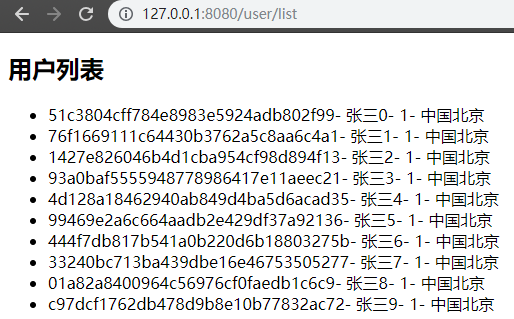 userList.add(new UserDto(UUID.randomUUID().toString().replace("-", ""), "张三" + i, 1, "中国北京"));