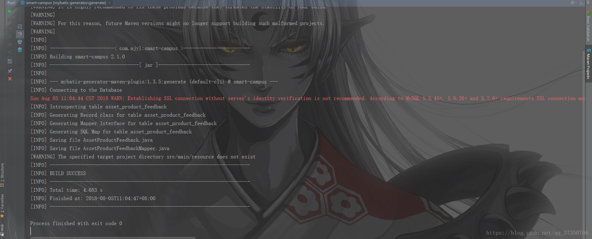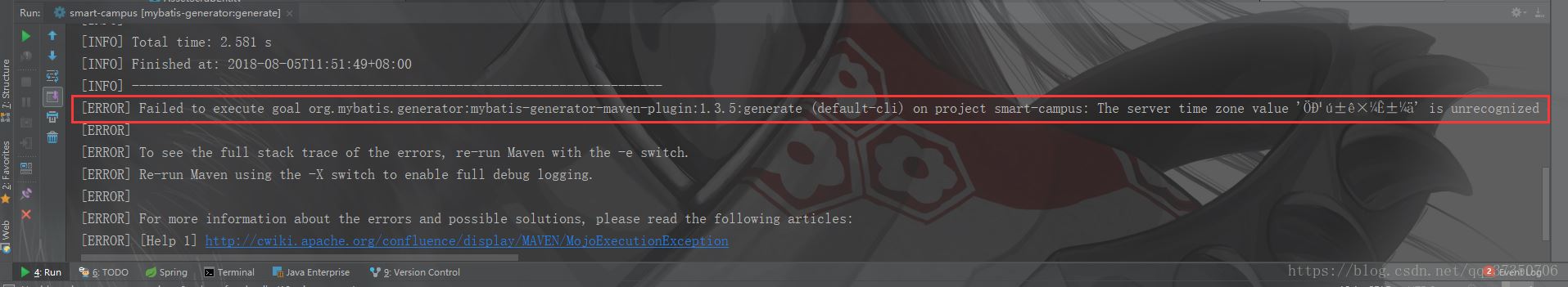 [INFO] ------------------------------------------------------------------------ [INFO] BUILD FAILURE [INFO] ------------------------------------------------------------------------ [INFO] Total time: 2.581 s [INFO] Finished at: 2018-08-05T11:51:49+08:00 [INFO] ------------------------------------------------------------------------ [ERROR] Failed to execute goal org.mybatis.generator:mybatis-generator-maven-plugin:1.3.5:generate (default-cli) on project smart-campus: The server time zone value 'Öйú±ê׼ʱ¼ä' is unrecognized or represents more than one time zone. You must configure either the server or JDBC driver (via the serverTimezone configuration property) to use a more specifc time zone value if you want to utilize time zone support. -> [Help 1] [ERROR] [ ERROR] To see the full stack trace of the errors, re-run Maven with the -e switch. [ERROR] Re-run Maven using the -X switch to enable full debug logging. [ERROR] [ERROR] For more information about the errors and possible solutions, please read the following articles: [ERROR] [Help 1] http://cwiki.apache.org/confluence/display/MAVEN/MojoExecutionException Process finished with exit code 1