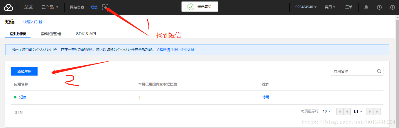 2:开通腾讯云的短信服务功能,添加应用。