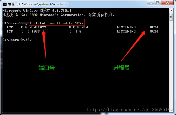 2、根据端口号查程序的进程号 netstat -ano | findstr 占用端口号(1099)