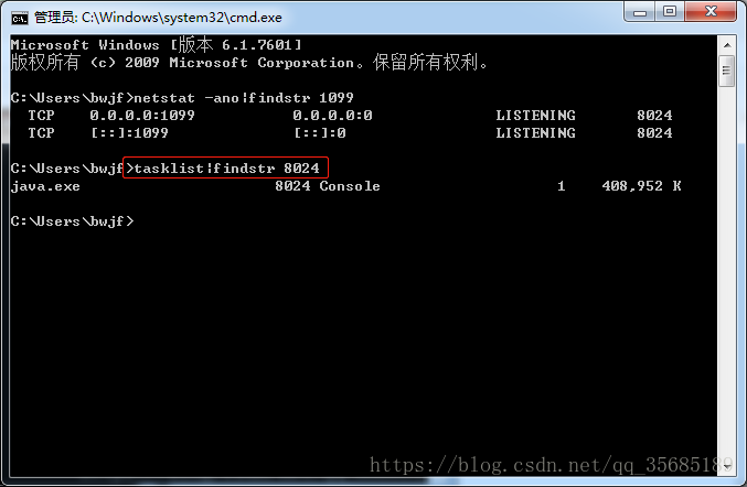 3、 根据程序的进程号查看具体的程序名称 tasklist | findstr 进程号(8024)