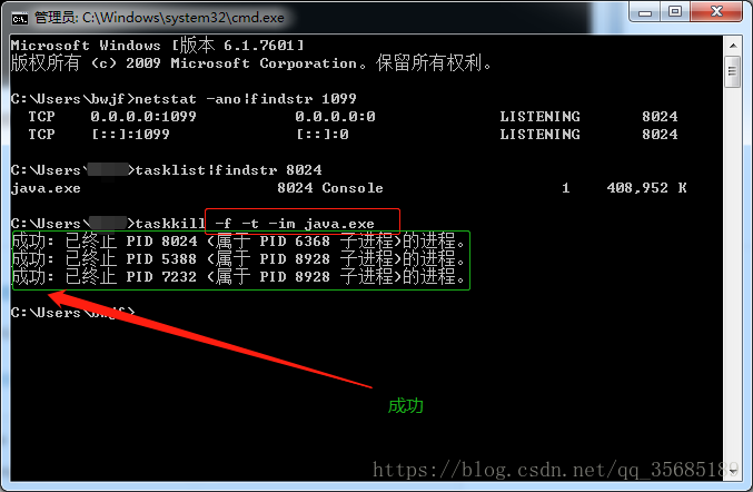 4、强制、递归 删除本程序及其子进程 taskkill -f -t -im 进程名(javaw.exe)