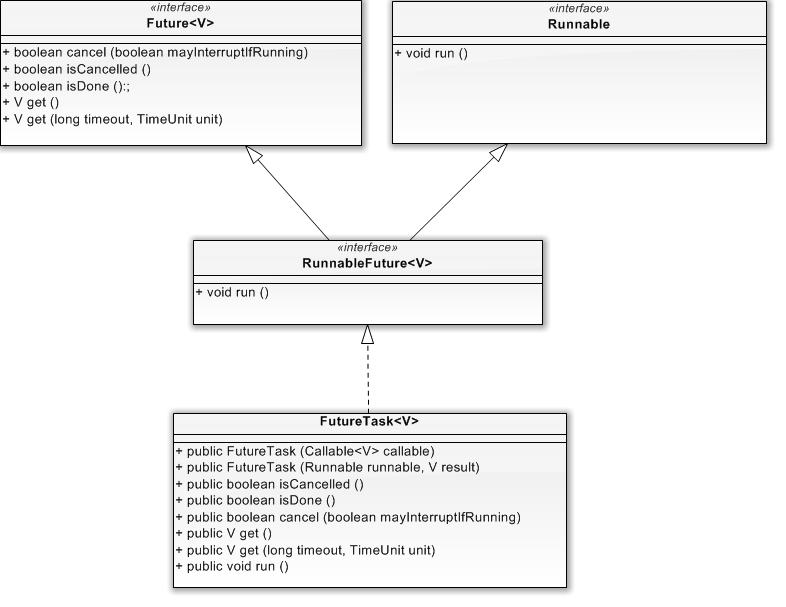 FutureTask 实现了RunnableFuture接口,而RunnableFuture则继承了Future<V>与Runnable接口,所以 FutureTask不仅实现了 Future<V>接口的所有方法,还具有自己的run方法,我们可以看下它的类图