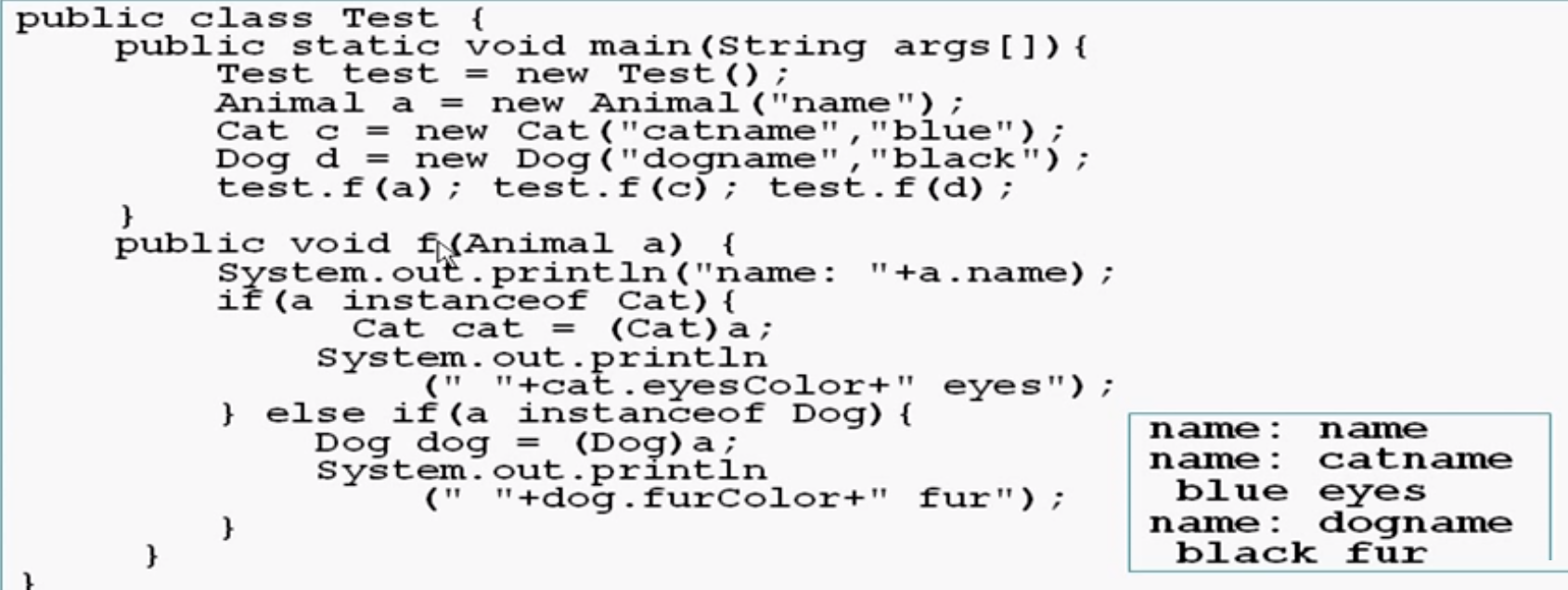 c作为Cat类型传入,Animal a作为形参,相当于执行了Animal a = new Cat(),这时a和c同时指向Cat对象,但此时a不能访问Cat类扩展的数据成员,所以再将a强转成Cat类型即可。如果不存在这样的转型机制,则针对猫和狗我们还要分别写两个函数f(Cat c)和f(Dog d)。但其实上图程序的可扩展性也不是最好的。我们还可以利用动态绑定(即多态)将扩展性进一步提升。多态机制的三个前提分别是: