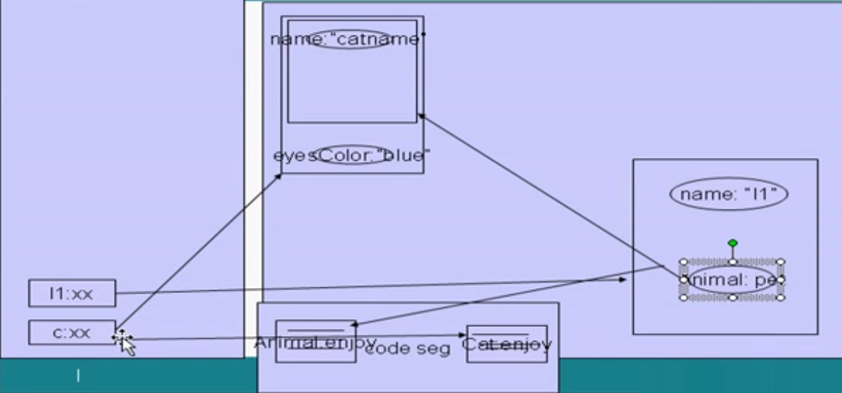 我们将形参设为父类Animal类型,当执行test.f(c)时,内存情况如下图: