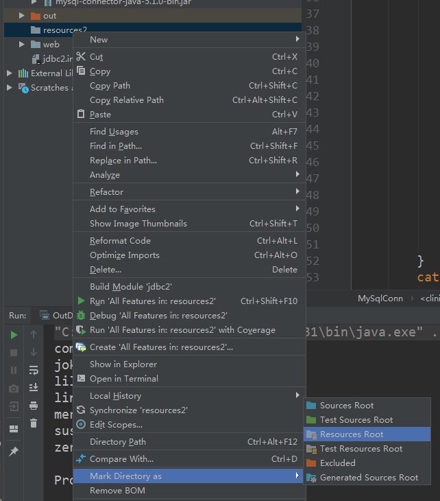 3.右键点击新建的resources文件夹,弹出的窗口里选择Mark Dictory as >>Resources Root将文件夹定义为配置文件(配置文件的作用请自行百度);
