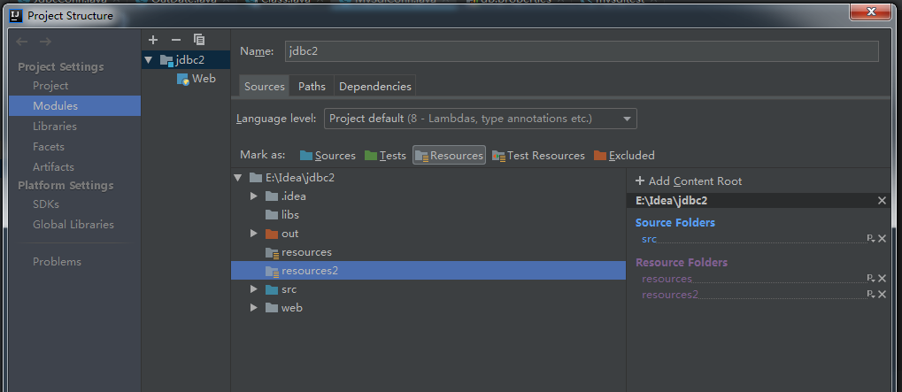 4.也可以通过Ctrl+shift+alt+s组合件打开Project Structure面板将需要的文件夹声明为配置文件类型