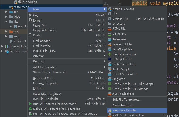 5.右键点击声明为resources类型的文件夹选择Resource Bundle,就能创架一个properties文件了。