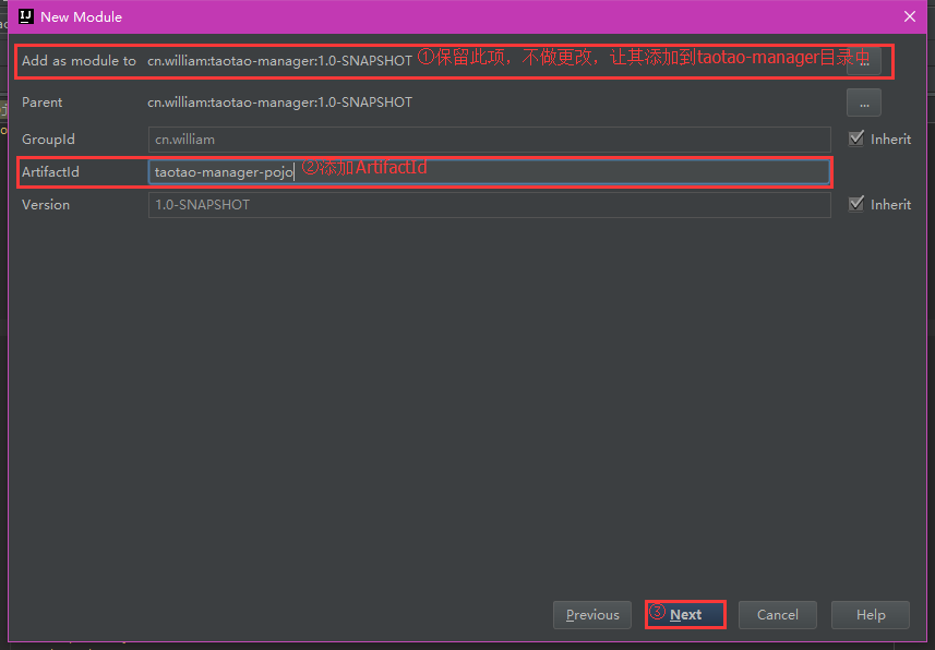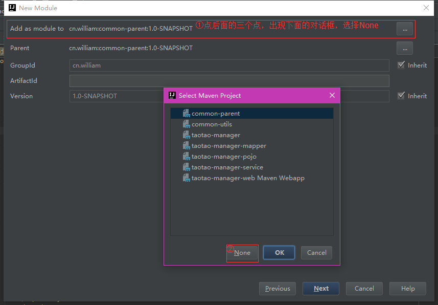 这一步注意,与创建common-utils时不同,是将其子模块添加到taotao-manager目录下的: