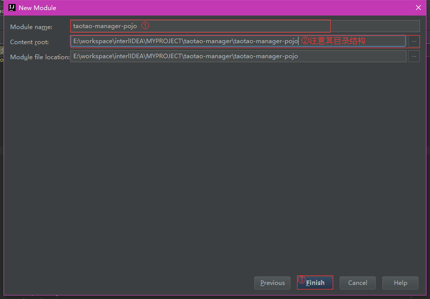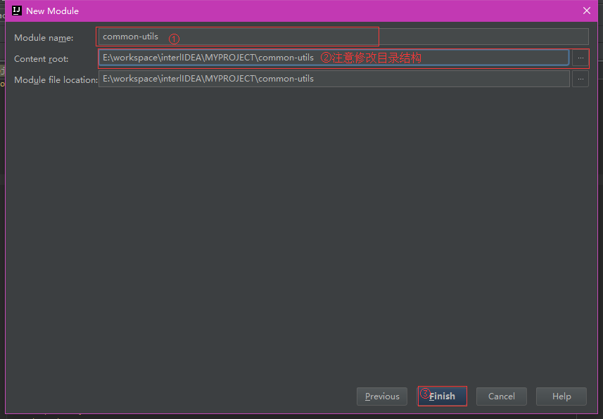 8. 创建父工程最后一步,给Module取名,及选择工作目录,选择完成