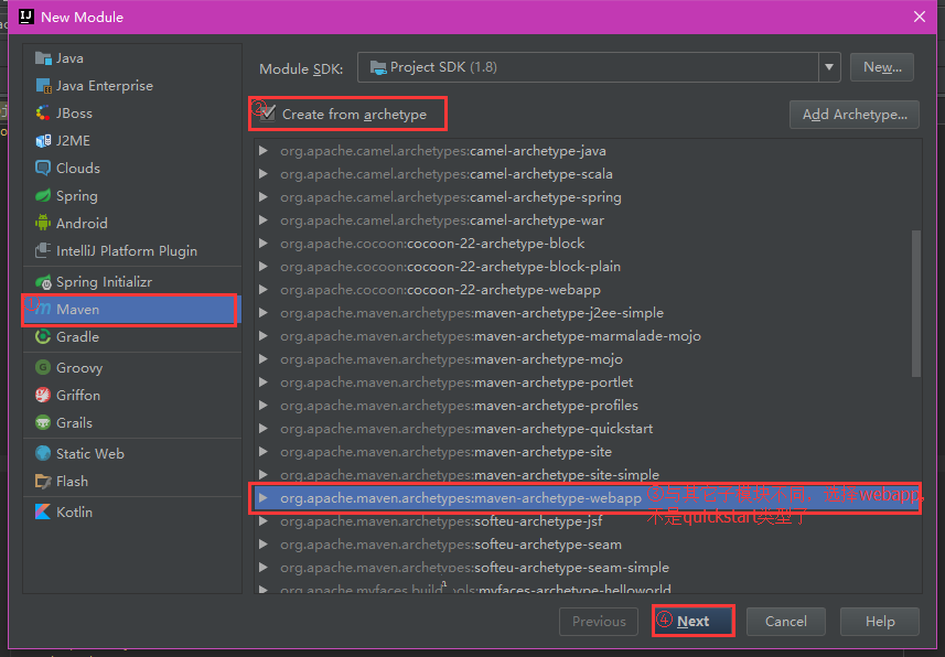 上面说的时创建taotao-manager-pojo子模块,另外三个子模块的创建方式与其类似,有一点不同时,在创建taotao-manager-web子模块时,maven项目的类型选择如下: