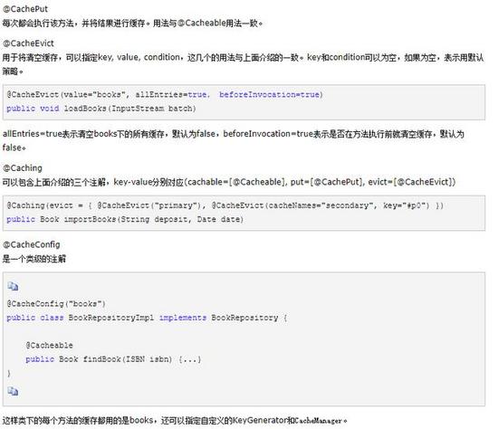 缓存都是通过key-value进行储存的,value或cacheNames必须指定(value是cacheNames的别名),指定多个value用(value = {"value1", "value2"})如果没有指定key,spring会提供一个默认的KeyGenerator,这个KeyGenerator根据参数生成key,如果方法没有参数返回KeyGenerator.EMPTY,如果有一个参数返回这个实例,如果有多个参数返回包含这些参数的SimpleKey。可以通过继承CachingConfigurerSupport自己指定KeyGenerator,类上加@Configuration注解。也可以像上面那样自己指定key,需要了解SPEL表达式。