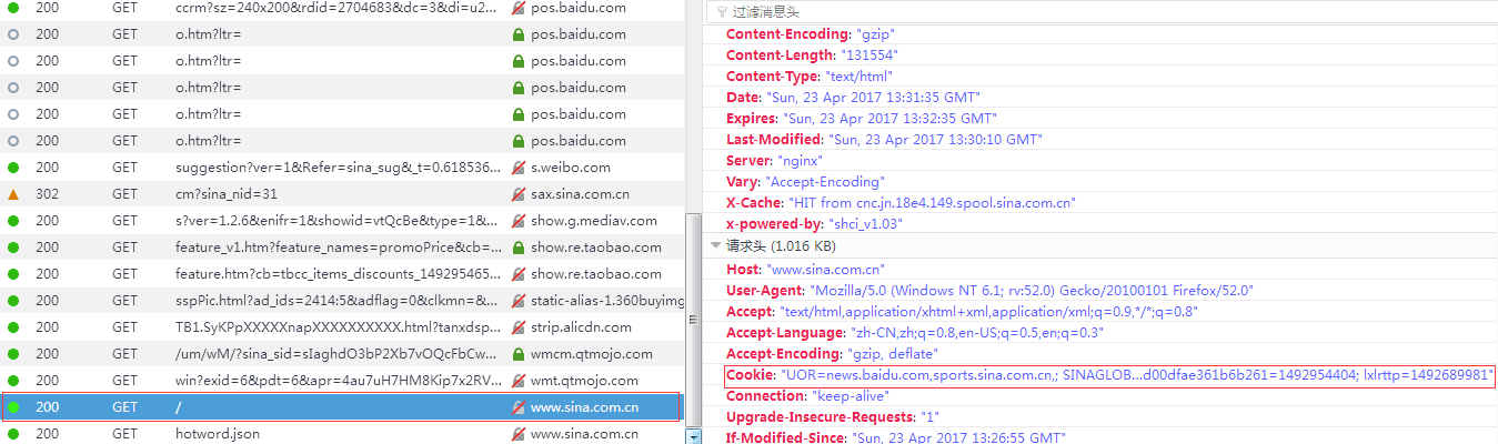 随意打开一个网址,用火狐的调试工具,随意选取一个链接,查看其请求头。你就会看到cookie的信息。如下图所示。