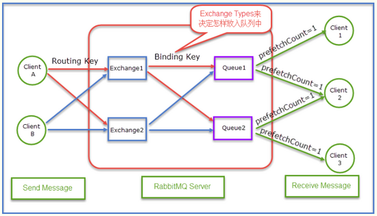 从图中我们可以看到RabbitMQ主要的结构有:Routing、Binding、Exchange、Queue。