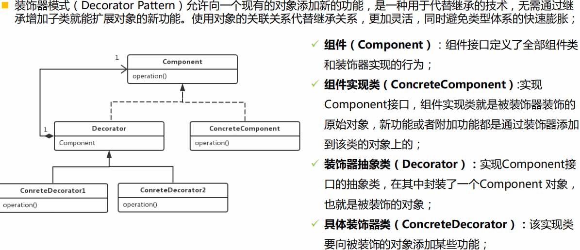 装饰器模式是一种用于代替继承的技术,无需通过继承加子类就能扩展对象的新功能。使用对象的关联关系代继承关系,更加灵活,同时避免类型体系的快速。