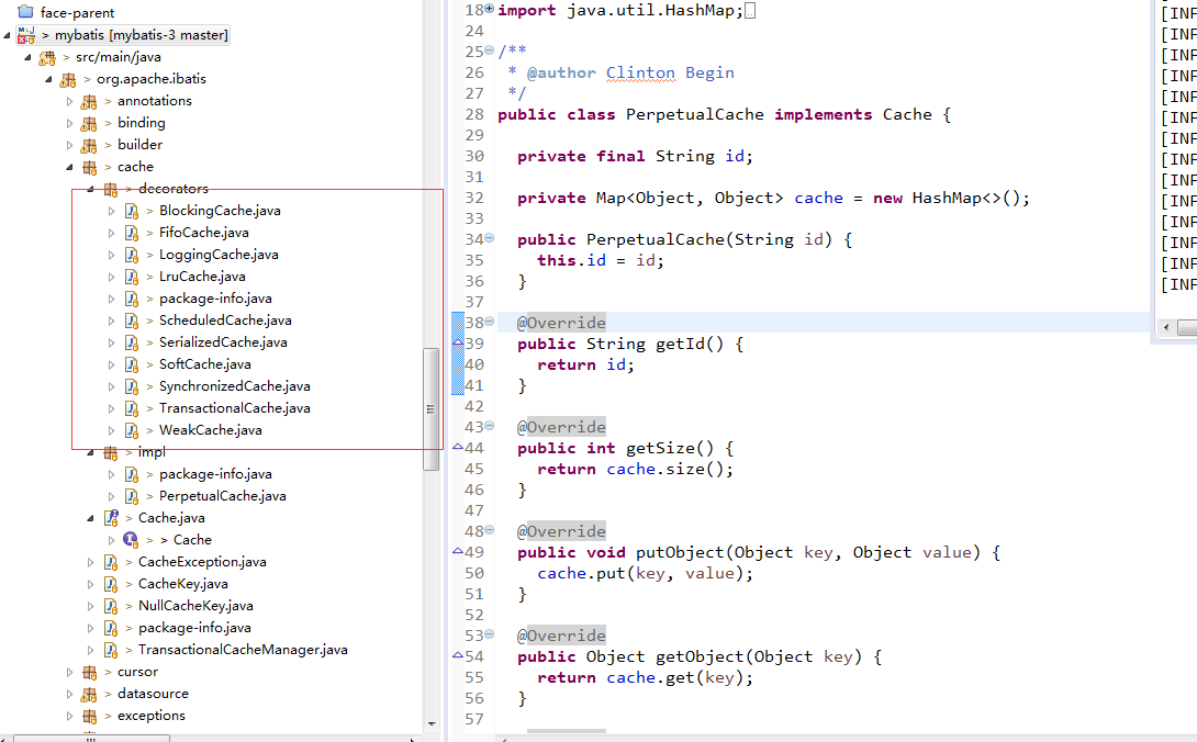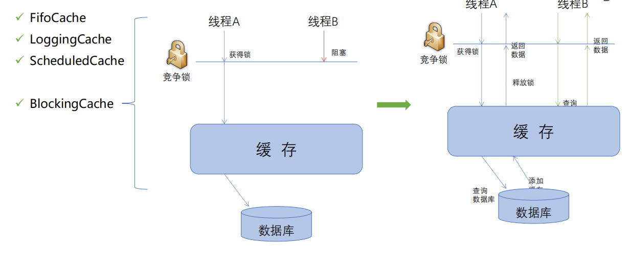 在缓存基本实现类PerpetualCache的基础上,创建了不同的装饰器对缓存进行了功能的增强,例如BlockingCache实现的是阻塞的缓存,FifoCache使用先进先出策略,ScheduledCache定时清空缓存,现在以