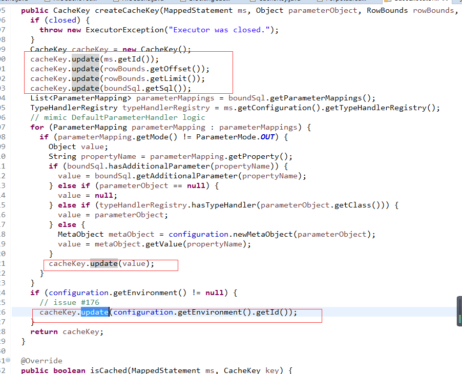 Mybatis通过上述算法确定cacheKey是否一致,mybatis在查询数据库之前,回先查询缓存,同时调用生成cacheKey的算法,通过下列源码可知影响缓存的因素包括mappedStatment的id指定查询结果集的范围(分页信息) 查询所使用的SQL语句 用户传递给SQL语句的实际参