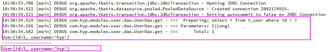 public static void main(String[] args) throws IOException { InputStream inputStream = new ClassPathResource("mybatis.xml").getInputStream(); SqlSessionFactory sqlSessionFactory = new SqlSessionFactoryBuilder().build(inputStream); SqlSession sqlSession = sqlSessionFactory.openSession(); UserDao mapper = sqlSession.getMapper(UserDao.class); System.out.println(mapper.get(1L)); System.out.println("-------------------"); System.out.println(mapper.get(1L));}