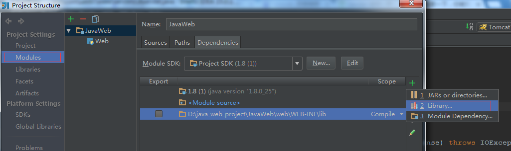 2.3点击 Modules --> 选中项目“JavaWeb” --> 切换到 Dependencies 选项卡 --> 点击右边的“+”,选择 “JARs or directories...”,选择创建的lib目录,这个目录用来存放依赖的jar包