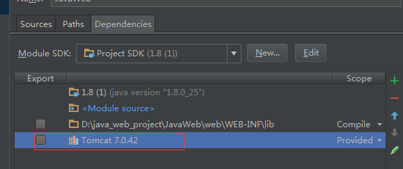 导入包的方法是创建项目并配置好Tomcat后,File->Project Structure,点击 Modules --> 选中项目“JavaWeb” -->切换到 Dependencies 选项卡 --> 点击右边的“+”
