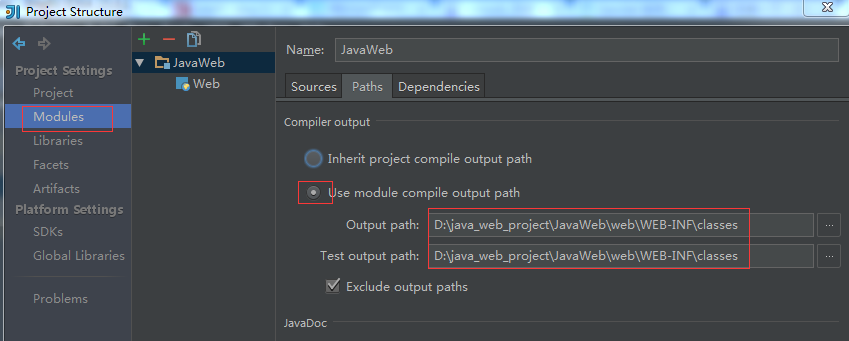 2.2File->Project Structure,点击 Modules --> 选中项目“JavaWeb” --> 切换到 Paths 选项卡 --> 勾选 “Use module compile output path”,将 “Output path” 和 “Test output path” 都改为之前创建的classes目录