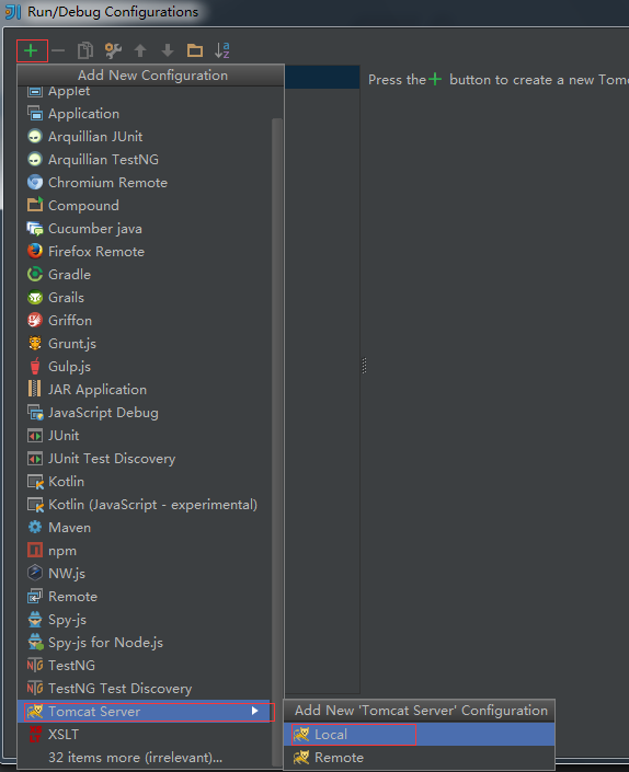 3.1 Run -> Edit Configurations,进入“Run Configurations”窗口,点击"+"-> Tomcat Server -> Local,创建一个新的Tomcat容器